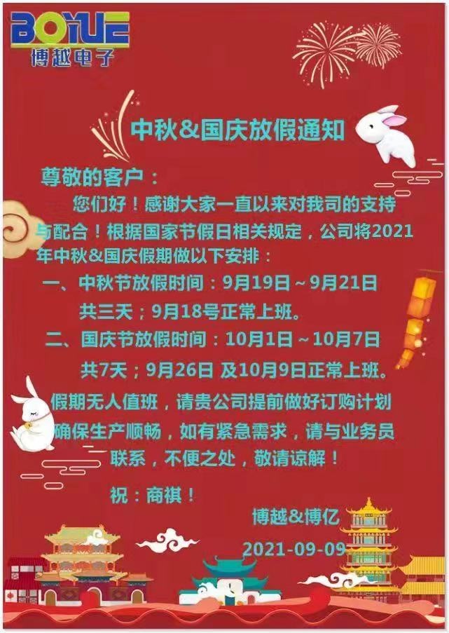 您們好!感謝大家一直以來對我司的支持與配合!國慶到來,普天同慶,共同慶祝偉大祖國72華誕!